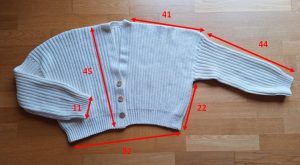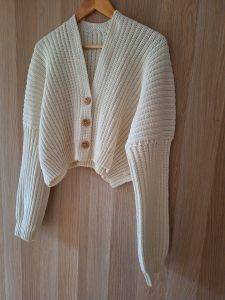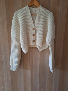 Po zakończeniu, schowaj wszystkie wystające końcówki. Następnie cały kardigan trzeba delikatnie zmoczyć/wyprać i rozłożyć na płasko. Nadaj również kształt i ponaciągaj gdzie trzeba aby uzyskać zakładane wymiary.