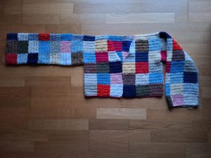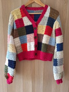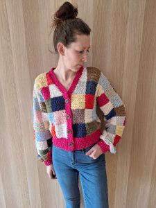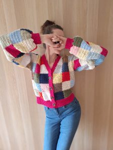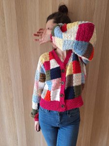 Kardigan, jak to u mnie często bywa, z resztek przeróżnych włóczek. Kolory dobierane dość przypadkowo, zaś włóczka do ściągaczy dobrana na zasadzie posiadanej ilości, czyli tej której miałam najwięcej. Jest lekki i fajnie się układa. Bardzoooo dla mnie wygodny. Do tego niezwykle łatwy w wykonaniu, tak naprawdę nie użyłam tu żadnego wzoru a same słupki. Kwadratów nie zrobiłam osobno a jedynie zmieniałam włóczkę co w pewnym momencie było kłopotliwe, bo trochę się plątały. Za to uniknęłam łączenia kwadratów i chowania niezliczonych nitek. Po skończeniu kwadratu wrabiałam je w następnym kwadracie. Kardigan robiłam zgodnie z zasadą im mniej zszywania tym lepiej.