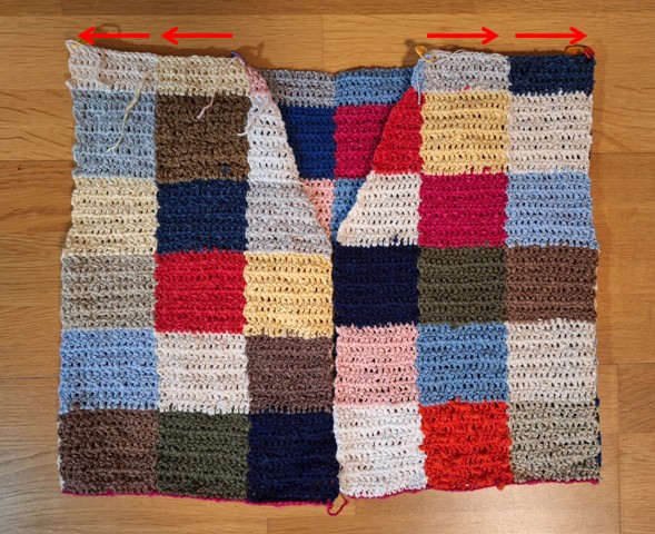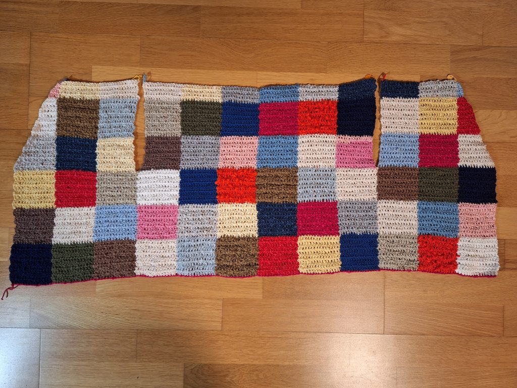 Kwadraty, które będą zszywane na ramionach zrób w tym samym kolorze, po zszyciu będą wyglądały jak pełne kwadraty. Zszyj ramiona tą samą włóczką co poszczególne kwadraty. Tułów mamy skończony.