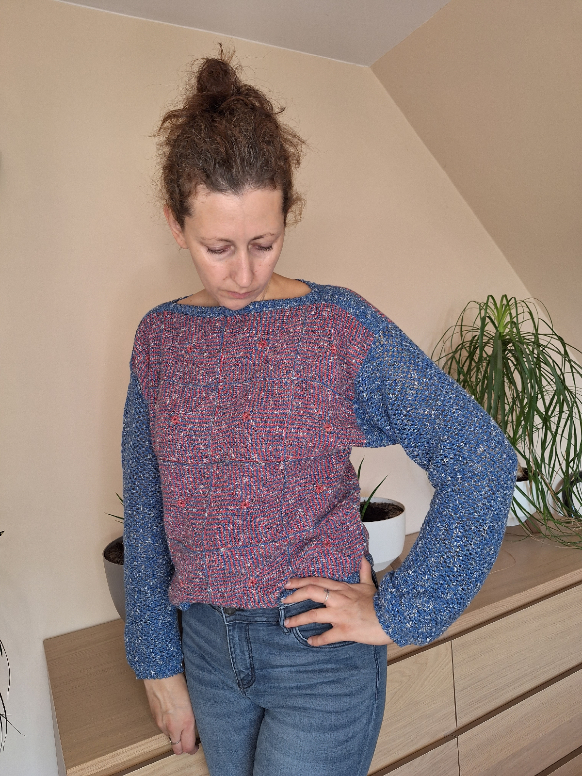 Postanowiłam zrobić lekki sweterek z cienkiej włóczki. Miałam do dyspozycji włóczkę z odzysku w dwóch kolorach, więc połączyłam je. Sweter z motywów w promienie, kwadraty wykonane ściegiem mech. Zawsze chciałam wypróbować ten ścieg i w końcu się udało!