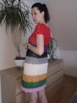 Sukienkę wykonuje się od góry do dołu. Ramiona z kółeczek wykonuje się osobno dwa w lustrzanym odbiciu. Następnie łączy się wykonując wzór główny, przodu i tyłu aż osiągniemy szerokość rękawa. Następnie trzeba zszyć dół rękawa, wykończyć je oraz dekolt. Dół sukienki przerabiałam w okrążeniach z odwracaniem po każdym okrążeniu, czyli przerabiałam na lewej i prawej stronie.