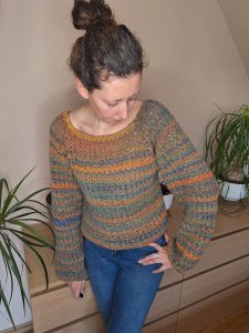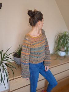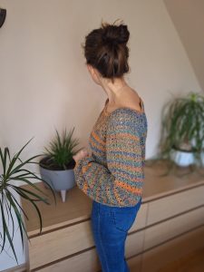 Uwielbiam proste sweterki i ten właśnie do takich należy! Kolorowy sweterek o luźnym kroju. Szerokie rękawy dodają uroku, a na pewno, swobody ruchów. Pasują do jeansów czy spódnicy, możesz go nosić bez niczego pod spodem, na podkoszulek lub na dopasowany golf jeżeli jest zimno. Bardzo prosty w wykonaniu, robiony od góry do dołu reglanem. Wykonałam go z włóczki frotte, ale możesz go wykonać z jakiejkolwiek innej.