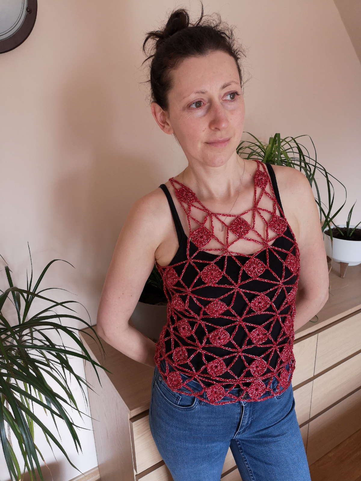 Rozmiar możesz dopasować używając większego lub mniejszego szydełka lub dokładając rzędy motywów w „pionie”. Pole do popisu jest duże, zależy tylko od Twojej kreatywności 😀 Zrobiłam top na swój rozmiar czyli S.